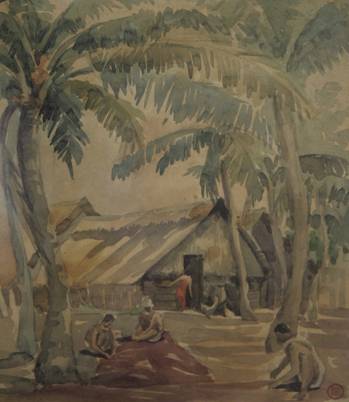 There is a sense of activity here in the figures: three people mending nets, and one a little way back walking into the house—perhaps to get some other materials? This gives life to a picture where, at first glance, it may seem like there is little motion. Kuo was known for his paintings of Malaysian scenes, and Mending Nets is an example of his specialty.