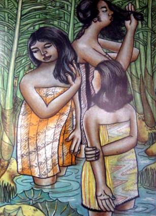 An early pastel dated 1962, Menyisir Rambut is one of Dzulkifli Buyong’s most daring compositions, featuring three tawny-skinned women, with their black hair down, in the act of berkemban. Two of them finger comb their waves and curls so they can feel and remove tangles and knots without snagging or snapping as the third watches. Finger combing on their wash day is by far the most convenient time to do it. One subject carefully divides a few sections of her hair to make it easier to finger comb. The scene captured by Dzulkifli also features a river estuary with Nipah in the background.