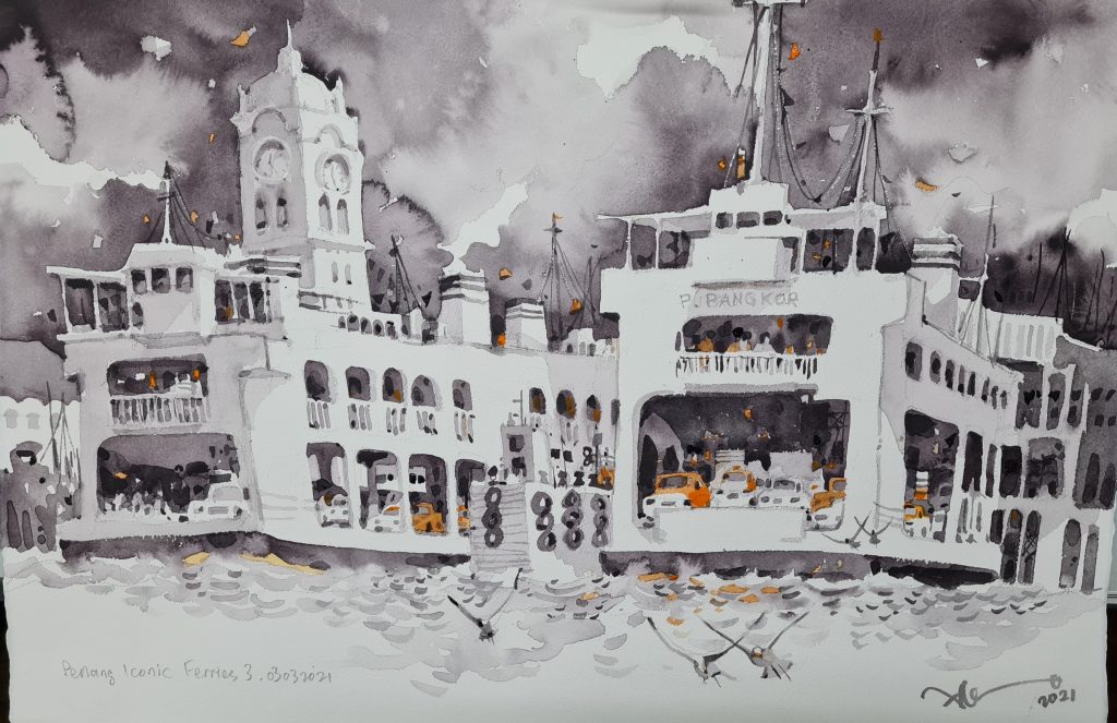 Leong Yim Kuan, Alex 梁炎坤, Penang Iconic Ferries 3, 2021, Watercolour on paper, 38 × 56 cm