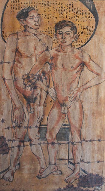 Can this work be read as the depiction of a pair of gay men by Patrick Ng? The gestures, postures, facial expressions, positionings, and the bond illustrated by the barbed wire can be read as subtle indicators or signs in understanding the work. Given the consideration that Malaysia is a conservative and Islamic country, the ‘coming-out’ process for a gay or lesbian—or any other sexual orientations or gender identities—is never easy or acceptable in the societal context, what more in the 1960s when this artwork was produced. Perhaps it is this issue that Ng intends to highlight in this particular work.