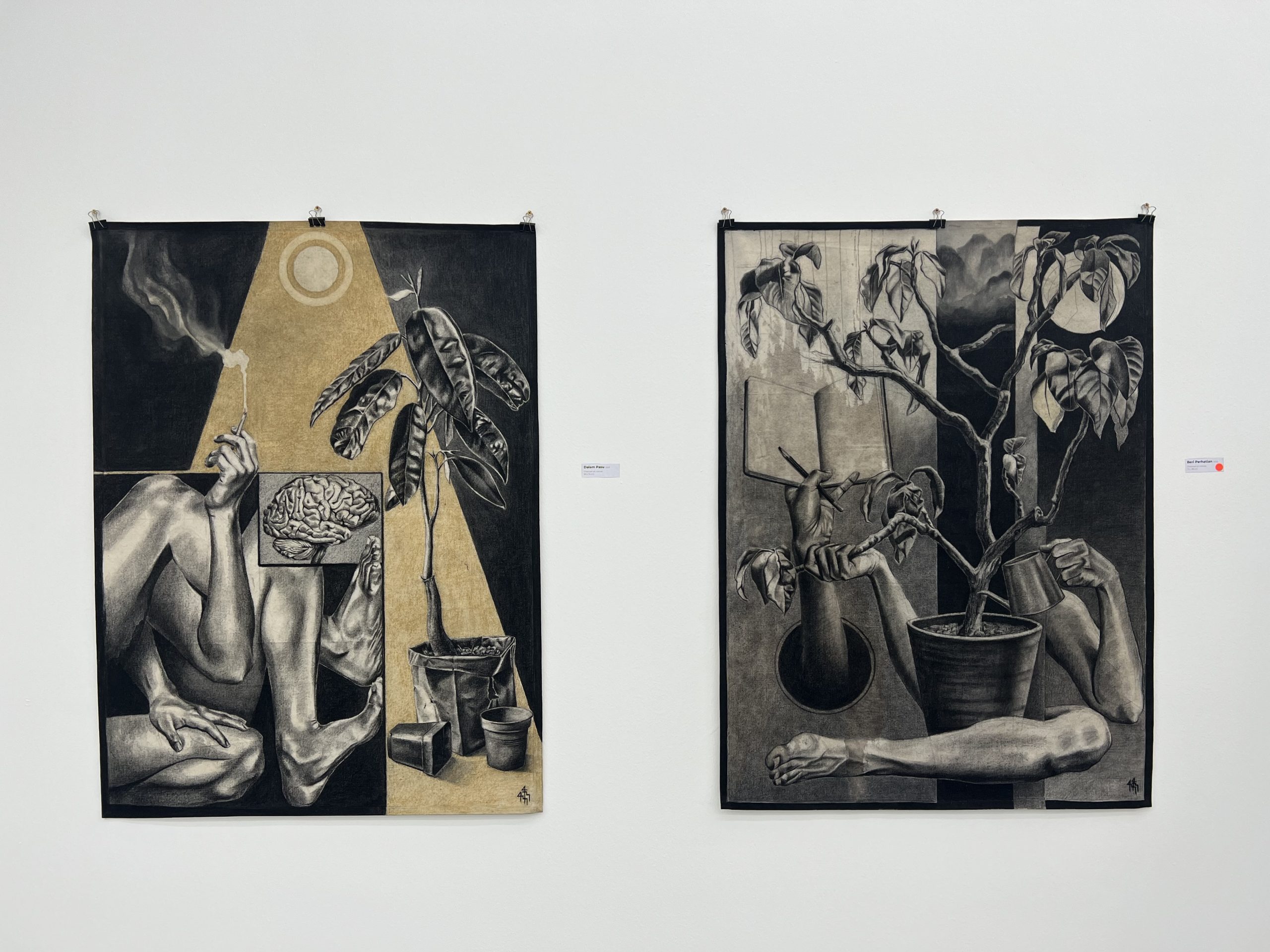 Fingers caressing a cigarette, hands tending a leaf branch, feet by a window, and calves intertwined with flower pots, metal poles, and even ribcages. There are shadows and contours, veins and muscles all shaded in black and white, using only charcoal and graphite.