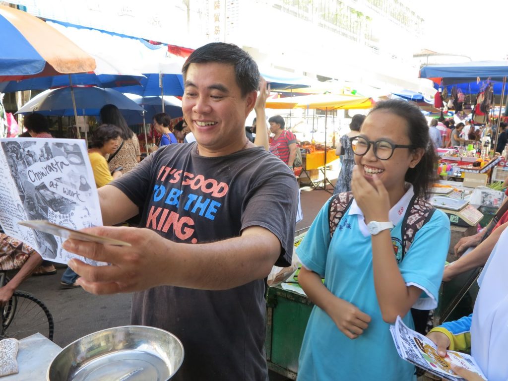 A Youth Arts Camp participant sharing her Chowrasta at Work zine with a market vendor. The zine looks at the ergonomics of vendors at work. This illustration workshop was led by Charis Loke.
