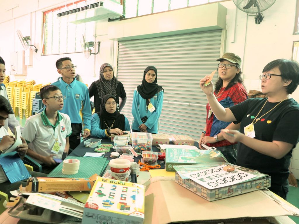Goh (far right) facilitating Youth Arts Camp participants in designing a boardgame inspired by a wet market