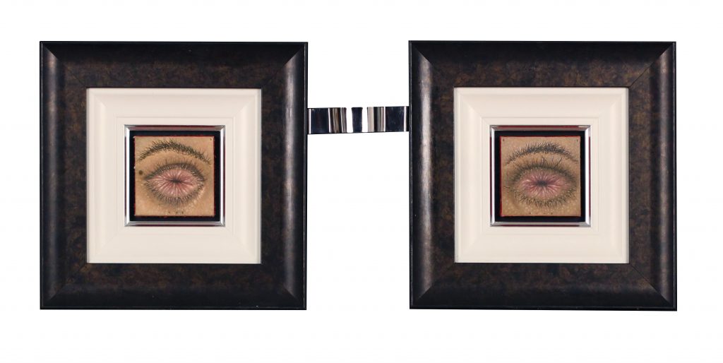 Chan Kok Hooi’s artworks serve as emotional allegories by which the artist navigates themes of nostalgia, imagination, and daily life through the lens of humour and absurdity. His artwork “Windows to the Souls” is an acrylic on canvas and glass diptych portraying two ‘eyes’ that quintessentially capture these themes. The title takes direct inspiration from the quote “Eyes are the windows to the soul”—the idea that by looking into the eyes of a person, one can understand their emotions and thoughts.