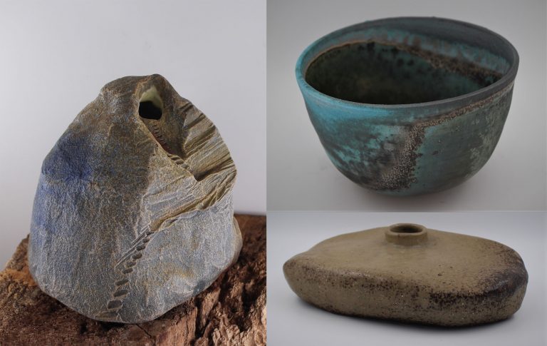 Artwork by Choo Teik Poh titled “A Quiet Place” (Left), “Big Bowl” by Khor Chun Chuan (Top Right), and “Stone Vase” by Cheok Teng Jui (Bottom Right)