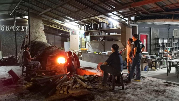 Penang potters on wood-feeding shifts at the traditional Anagama kiln in 2022.
