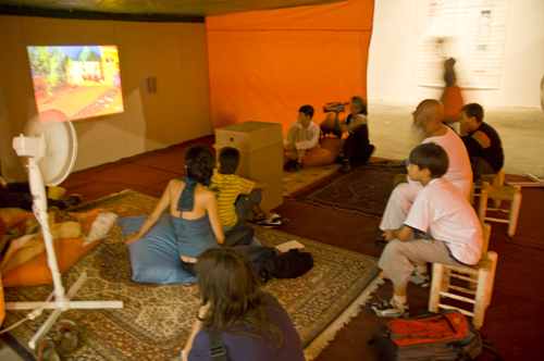 The Roma children and their Imam had a preview of the video they made with Wong, Oh Sulukule, Darling Sulukule (2007), in a tent with cushions during the Istanbul Biennial 2007.