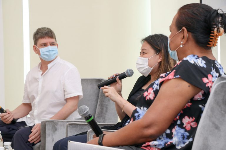 Wan Phing Lim (centre) and Regina Ibrahim in conversation with Marc de Faoite during the Little Worlds of Make-Believe event of GTLF 2021.