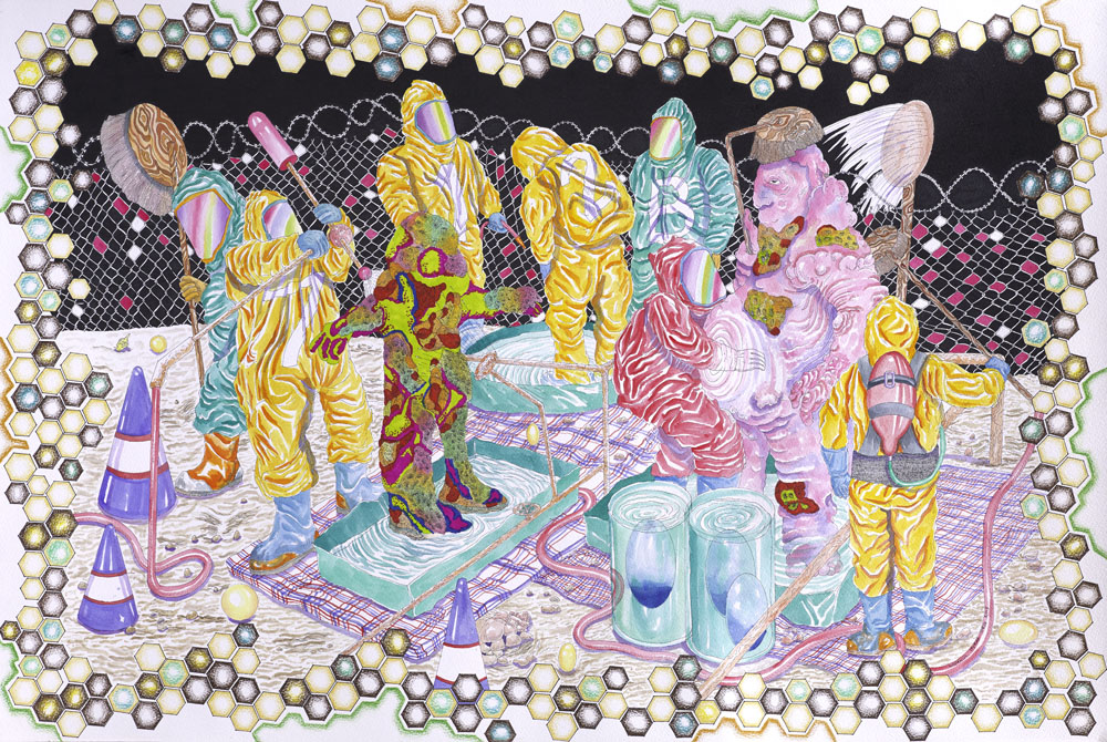 In his HOL Chapter 2.3, Wound : Environment of Naga and Doubt (2018) exhibition, the Perak native draws from an eerie remove, illustrating a distant but familiar post-apocalypse future, where groups of people are divided into departments in charge of border control, medical aid, conservation and preservation.