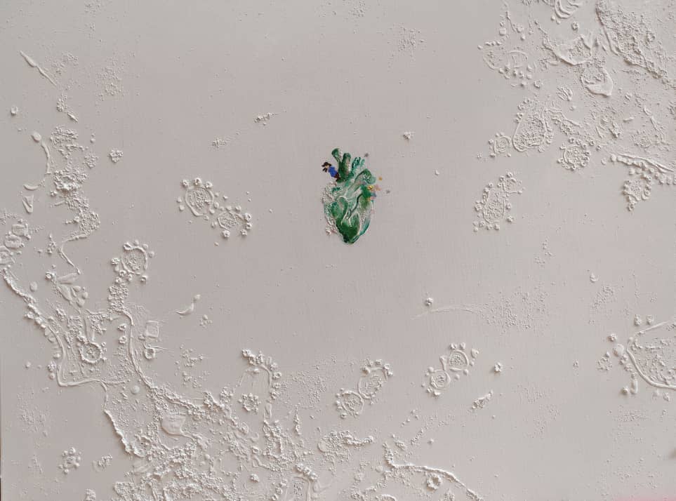 Mixing acrylic with sand, eggshell, tissue to show the rawness and using plain white to tune the rough texture down. Keeping it in a simple colour tone to brings out a different point of view in showing a complicated feelings. Using coronavirus microscope photos as the planet of the artist created. Showing