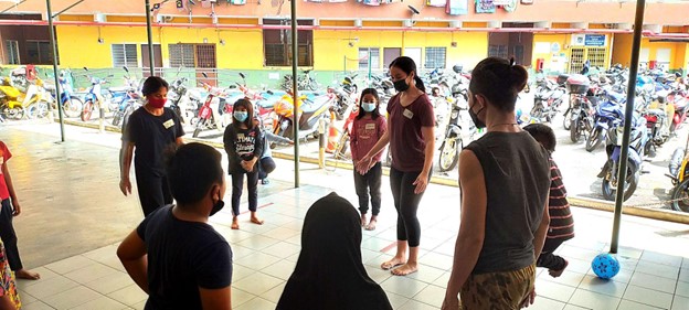 Kalia working as a facilitator to teach movement at Flat PPR, Jalan Sungai, part of Projek Seni di Komuniti: Gempak 100 by ArtsEd.