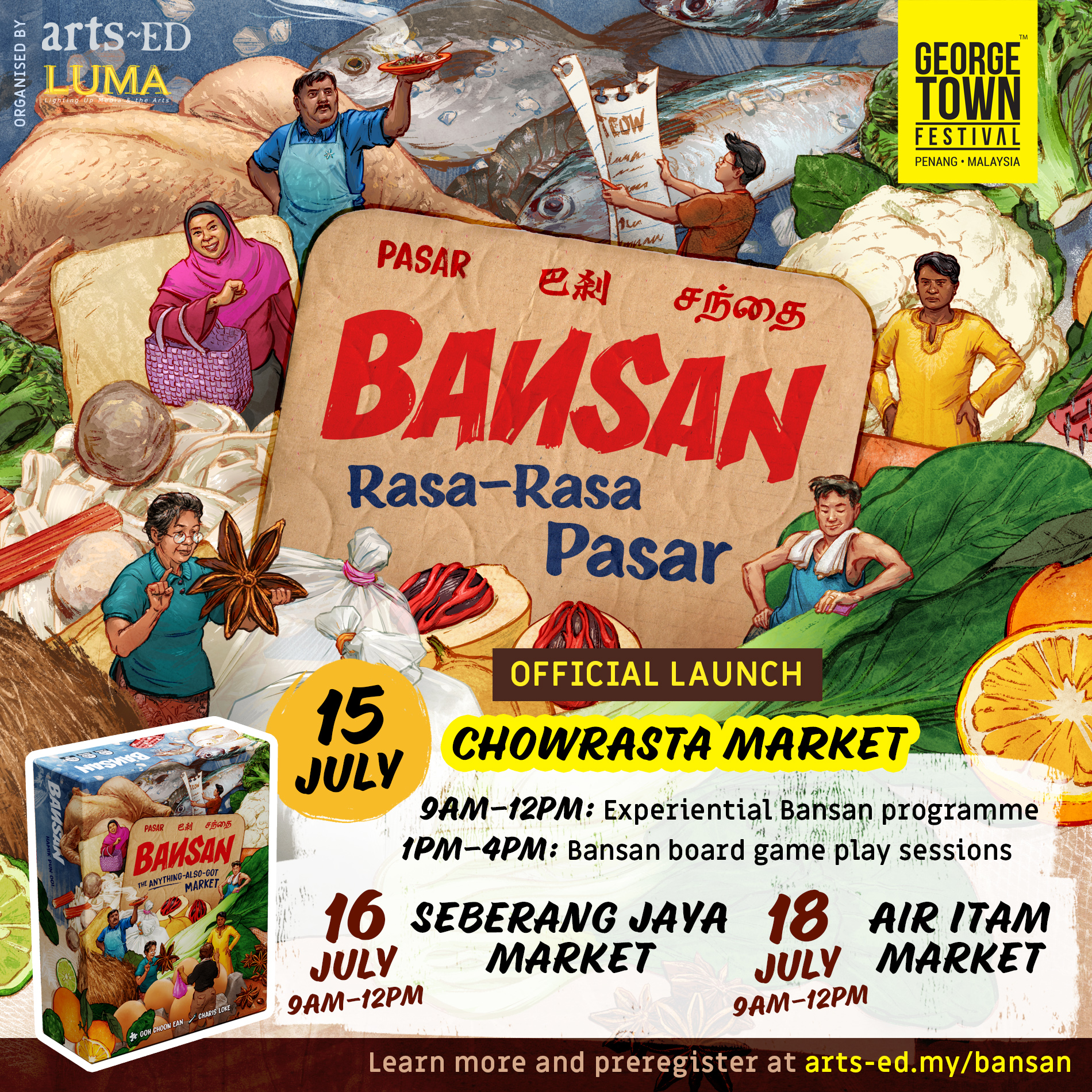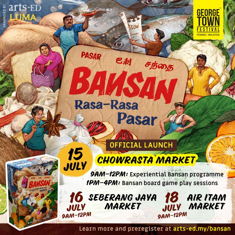 Engage in the vibrant world of a local wet market with the official launch of the board game Bansan, a collaboration between Arts-ED Penang and LUMA, where players navigate the intricacies of a local wet market as they interact with wholesalers, vendors, municipal council officers, and customers.
