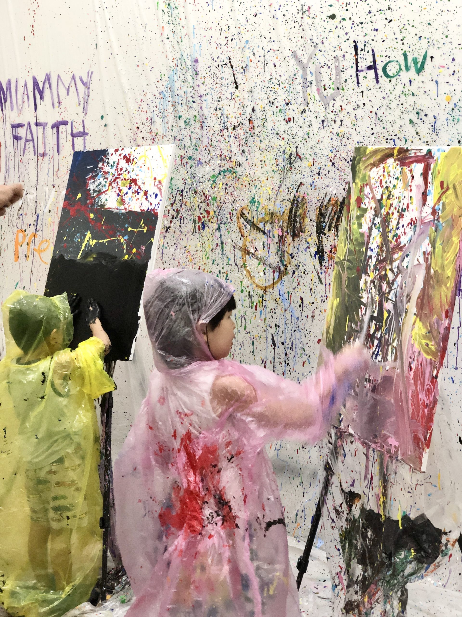 “We originally targeted adults,” Yeoh said, drawing back a curtain to reveal the paint-splattered art room, “but as it turns out, kids love it because they can’t make a mess at home, but they can here. It can be hard to clean up, though,” she added, indicating the floor outside the art room, where participants often walk past with paint dripping off their protective raincoats.