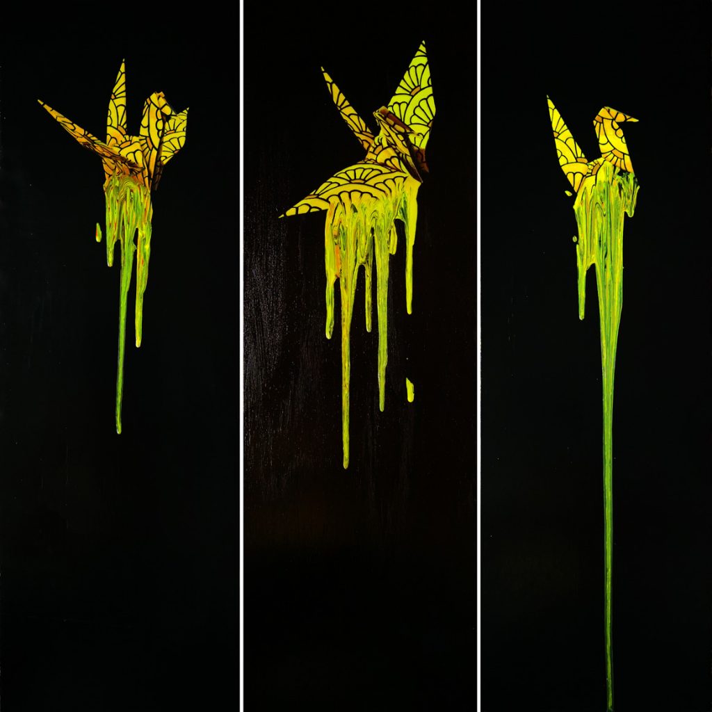 I painted the melting origami crane in triptych to create a usual chronology of the symbol falling. Metaphorically, the idea of “hope and health” is still live but each individual is now allowed to choose their own symbol that gave them hope.