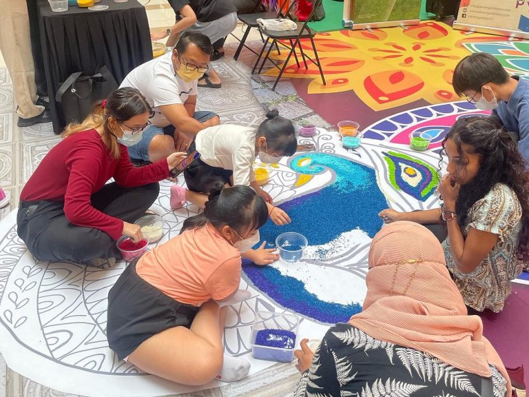 The Community Kolam Art Project in October 2022 invited visitors to Gurney Plaza to help complete the kolam in conjunction with Diwali.
